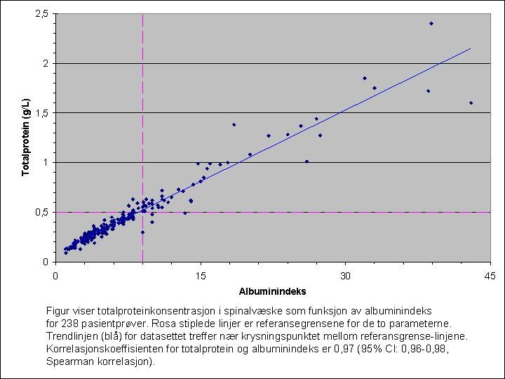 Økt albuminindeks gir holdepunkt for blod-hjerne-barrieresvikt og albumin-indeks korrelerer meget godt med totalproteinkonsentrasjonen i spinalvæske i et pasientmateriale (se figur). IgG-indeks korrelerer derimot ikke med totalproteinkonsentrasjonen.